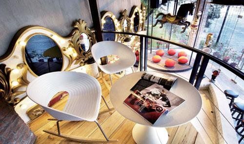 門口棧道旁邊的咖啡杯上,如果有一男一女坐著聊天,大家可別把他們誤會成一對情侶,他們更多的是在談工作。經(jīng)過前臺,客戶主任E m m a告訴南都記者,除了正門旁邊那個彌漫古典氣息的會客室外,夾層的閱覽室、二樓的露天茶座……辦公室里隨處都能開會,其中最為吸引人的就是正對門口的兩個摩天輪包廂。