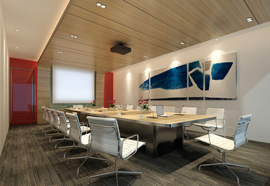 會議區(qū)辦公室裝修采用了進口高級木質(zhì)板材來做了平面天花和投影背景墻,表達簡單的裝修就是最好的理念,展現(xiàn)高檔辦公室豪華裝修的真是品質(zhì),確立它的地位和權威。石膏板加隔音棉的墻身,加強會議室的隔音效果,這是辦公室豪華裝修才有的高級材料。非常高貴大氣的裝修。