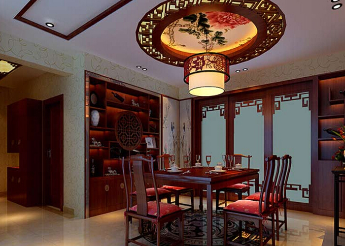 朱紅色的餐桌椅,配上精致的燈飾,使整個空間硬朗而又華麗、優雅。餐廳的裝修又是木質鏤空隔斷,大氣經典。墻面的壁紙與吊燈都顯示出一種富麗堂皇的感覺。